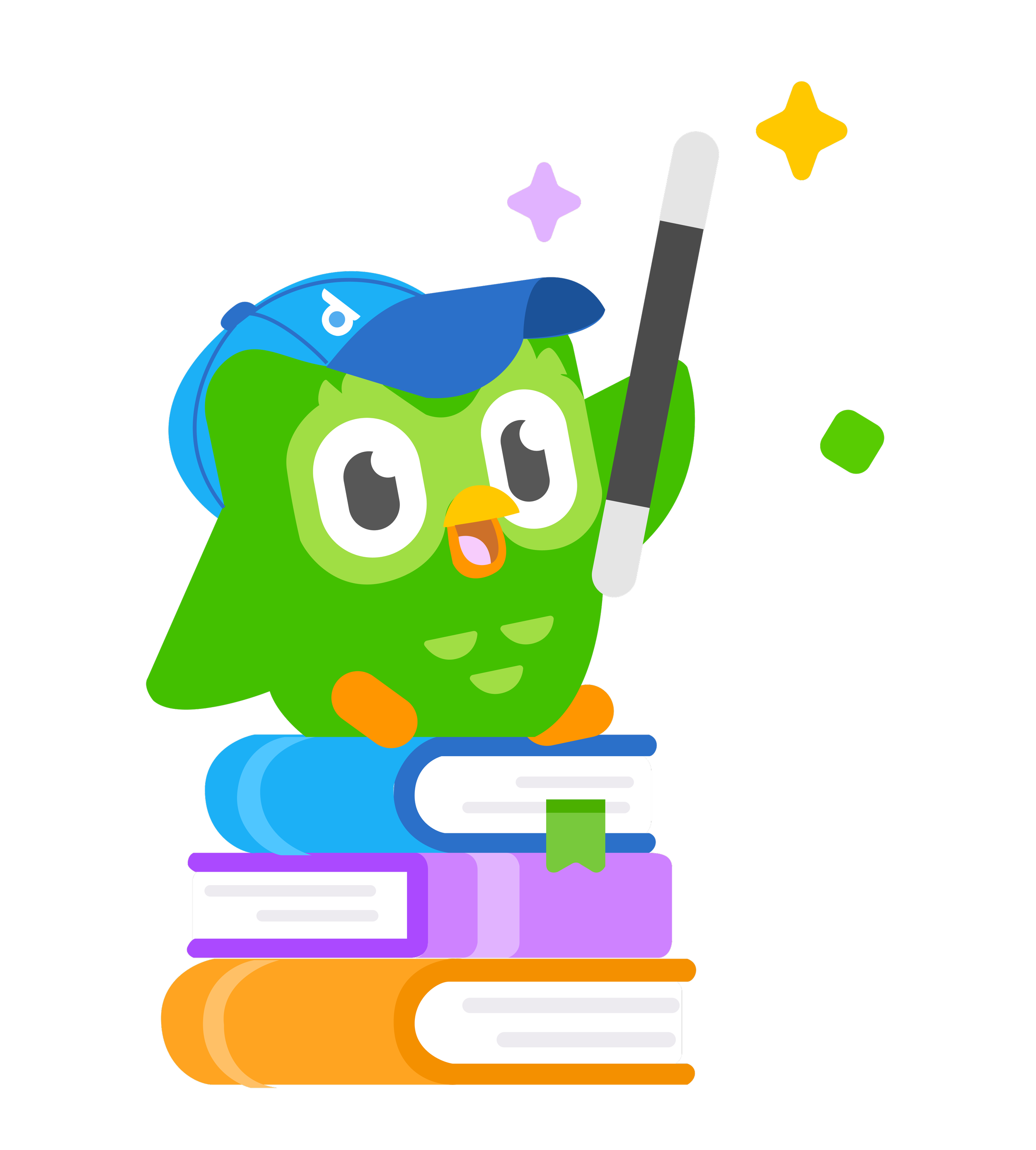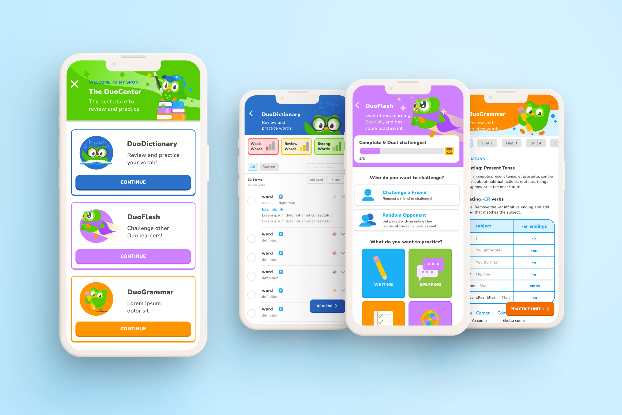 A learning center within Duolingo featuring three unique review options: DuoDictionary, DuoGrammar and DuoFlash.