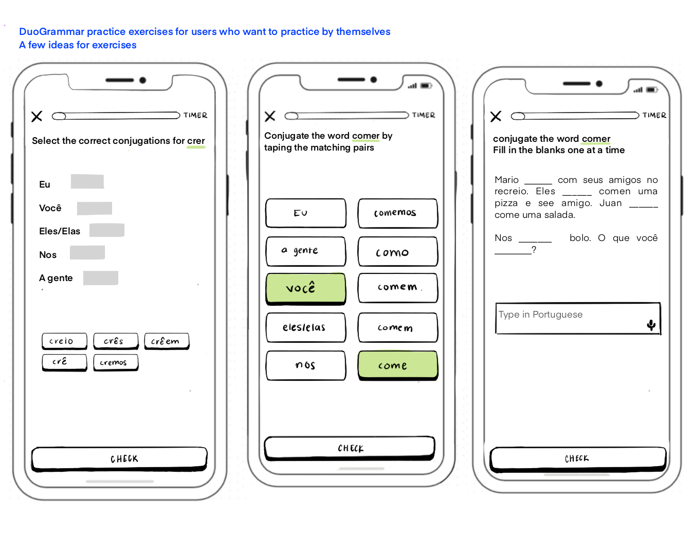 I also knew that of the 3 problems I identified, two needed to be newly introduced to the product: grammar and an interaction aspect. The problem of needing a better way to review vocabulary and lessons simply needed to be improved.