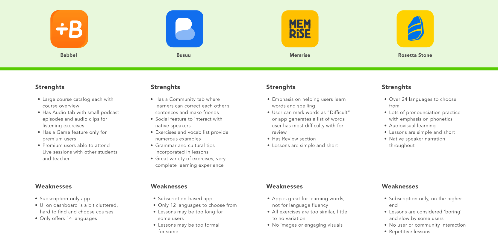 Duolingo has a competitive advantage in that it has some of the most fun and engaging exercises; it’s also the only free platform.