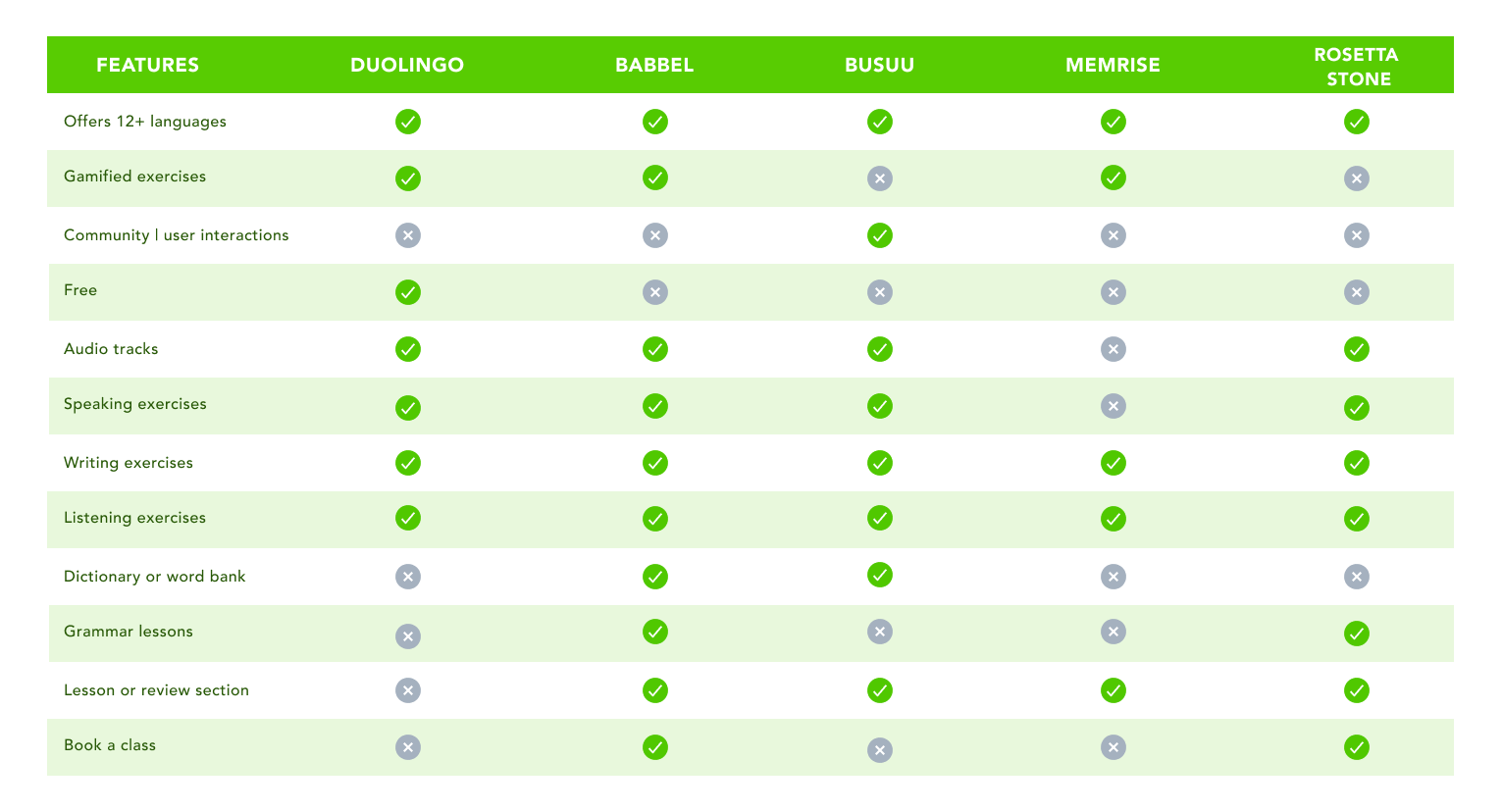 Most apps currently have similar features such as lesson reviews and word banks that Duolingo lacks.
