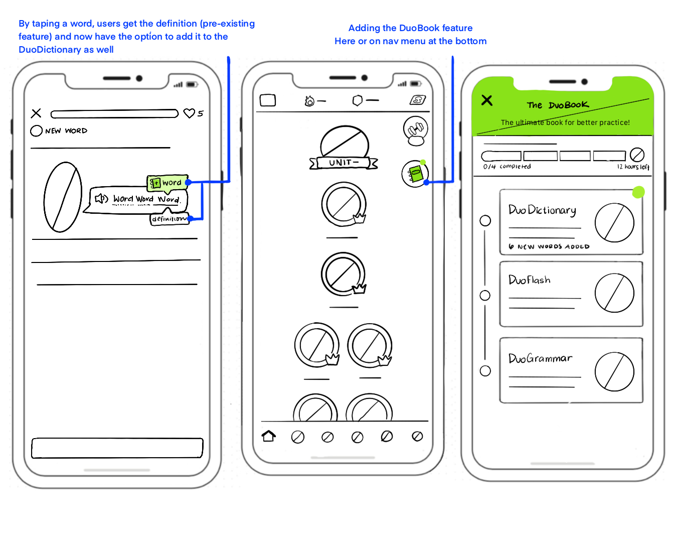 After I came up with a concept for a new feature that would tackle all three problems, I created low fidelity sketches for the new concept and its three sub features. I sketched keeping in mind that this new feature had to seamlessly fit with the existing Duolingo app product.