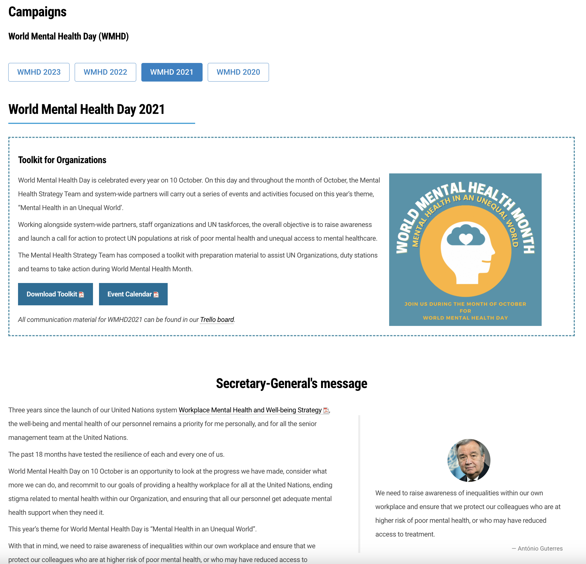 Created the United Nations’ World Mental Health Campaign 2021 design system and digital assets, and coordinated the WMHM systemwide events.